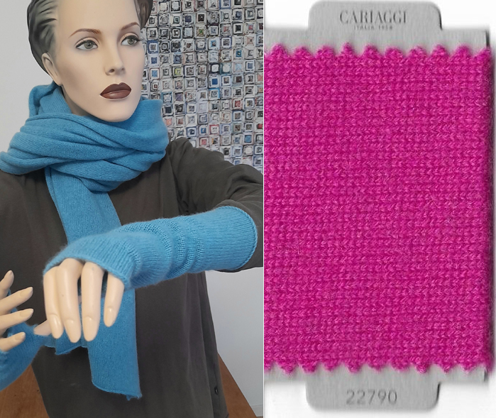 100 % Kaschmir in einer farblichen Abstimmung, aus der auch andere feine Accessoires gestrickt werden können, so das sie ein passendes Set zusammenstellen können.